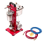 Пневматическая установка, не дающая искру. Проста в управлении. Очистка системы происходит за счет циркуляции промывочного сольвента. Конструкция с сетчатым фильтром и 5-ю фильтрующими элементами не только очищает, компрессор, но и продлевает срок службы всей системы. Объем резервуара: 2 л.