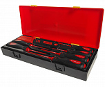 Набор диэлектрический 24 предмета. В комплекте: трещотка 1/2"; изолированный удлинитель 5"; изолированные головки 1/2": 10, 12, 13, 14, 17, 19, 22, 24 мм; ключ с Т-образной рукояткой с изоляцией 1/2", нож электромонтажный; отвертки с изоляцией: РН1х4", РН2х4", шлицевая 5.5х5", 4.0х4"; рожковый ключ с изоляцией: 7, 8, 10, 12, 14 мм; клещи с изоляцией: 8" универсальные клещи, 6", бокорезы.