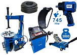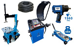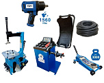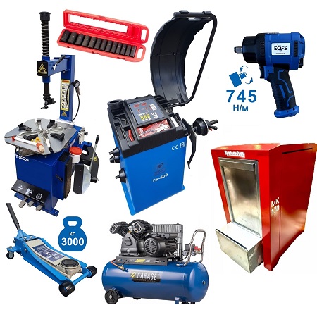 Комплект: шиномонтажный станок TS-21 для дисков: внешний 11÷20” + пистолет с манометром для подкачки шин + монтажка + пластиковые накладки на зажимные кулачки + регулятор давления с влагоотделителем и манометром. + TS-500 балансировочный станок с автозапуском, для колес легковых автомобилей и легких грузовиков, диаметр диска с резиной до 760 мм. размеры диска: ширина 3"–9” (76-228 мм), диаметр диска 10"–21” (254-533 мм). + кожух защитный + клещи + кронциркуль + быстрозажимная гайка + набор конусов + подкатной домкрат г/п 3,0т. 130-465мм. + ударный пневмогайковерт 1/2" крутящий момент 745Нм + шланг кислородный 9мм 20Атм. 10м + переходник для подключения.