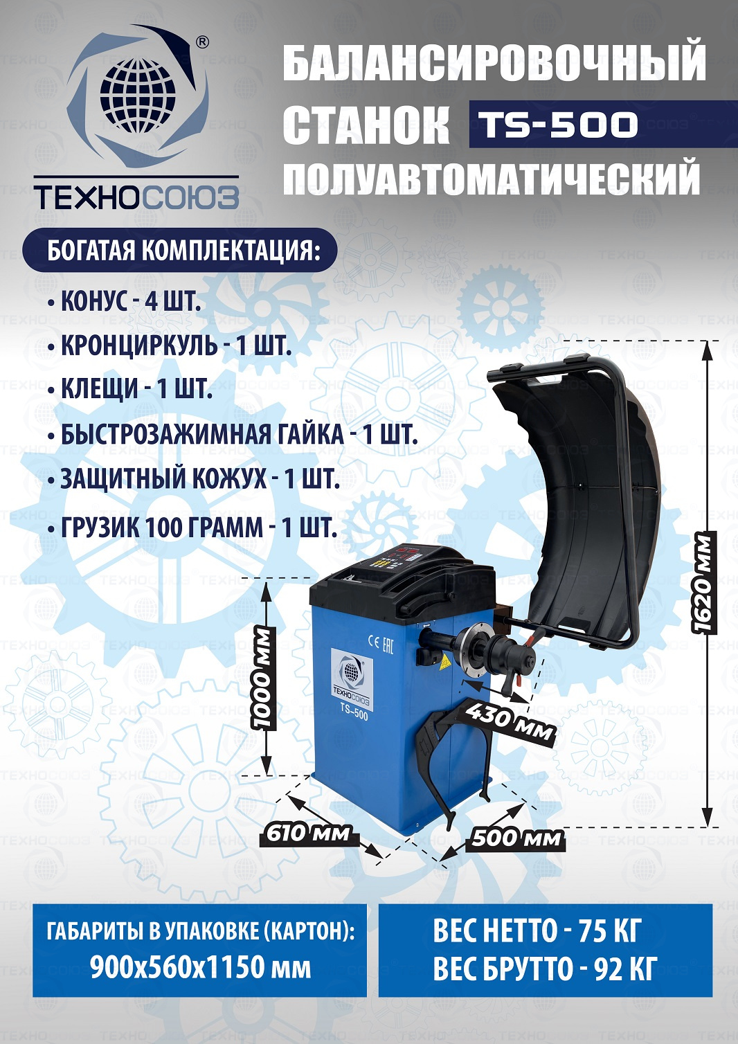 TS-500 с лазером. Балансировочный станок полуавтоматический. Лазерная указка места установки грузика. Режимы работы: STANDART, STATIC, ALU1, ALU2, ALU3. Автокалибровка. Режим оптимизация дисбаланса. Режим MOTO. Автозапуск при опускании кожуха. Для легковых авто и «Газелей» с диаметром диска с резиной до 760 мм, диаметр диска 10–24” (256-610 мм). Гарантия 12 мес.