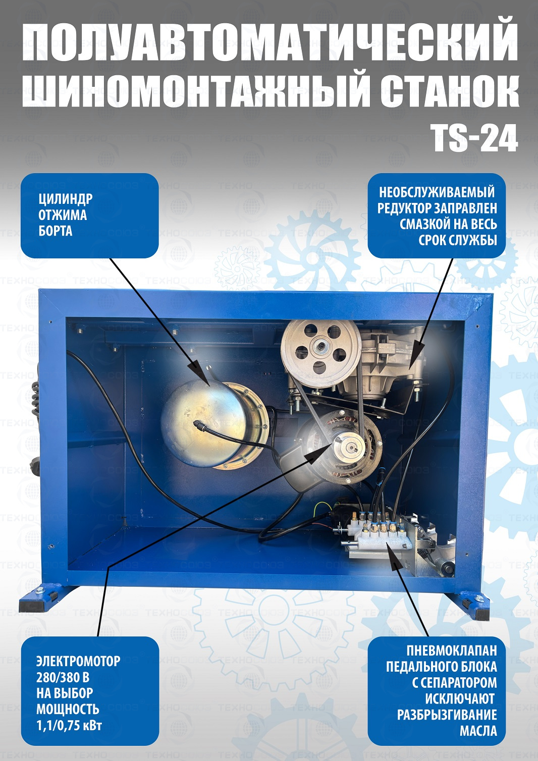 TS-24 шиномонтажный станок. Полуавтоматический. Квадратный стол. Для дисков: внешний 11÷21”, внутренний 12÷24”. Усилие отрыва покрышки 2700 кг. В комплекте: пистолет для подкачки шин + монтажка + пластиковые накладки на зажимные кулачки + регулятор давления с влагоотделителем и манометром