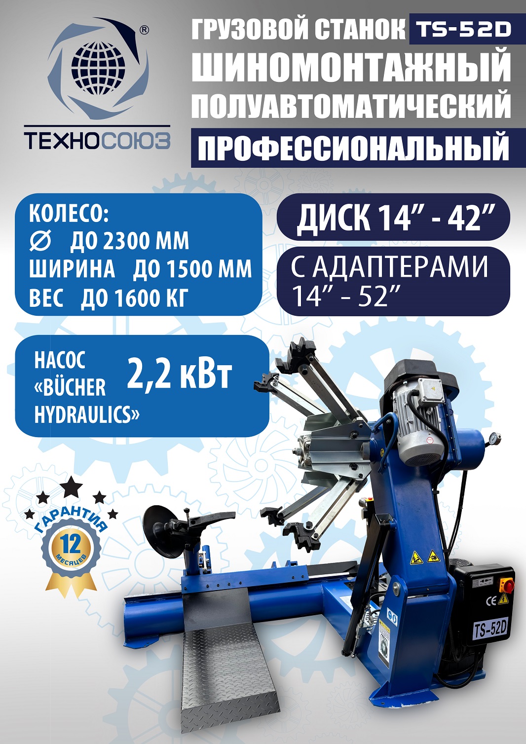 Комплект из TS-52D грузового шиномонтажного станка для дисков 14”-42”,  с удлинителями на захваты до 52” - очень качественный станок. За последние 9 лет ни одной рекламации!!!  Диски сталь + ALU Ø 14÷42” с адаптерами 14÷52”(опция). Максимальное колесо Ø2300 ширина 1050мм, вес до 1600кг. Моторы 2,2 + 2,2 кВт, 380В. Гарантия 12÷18мес. Гидронасос «BUCHER HIDRAULICS». Cтанок подходит для тракторов, сельхозтехники, еврофур и т.п.