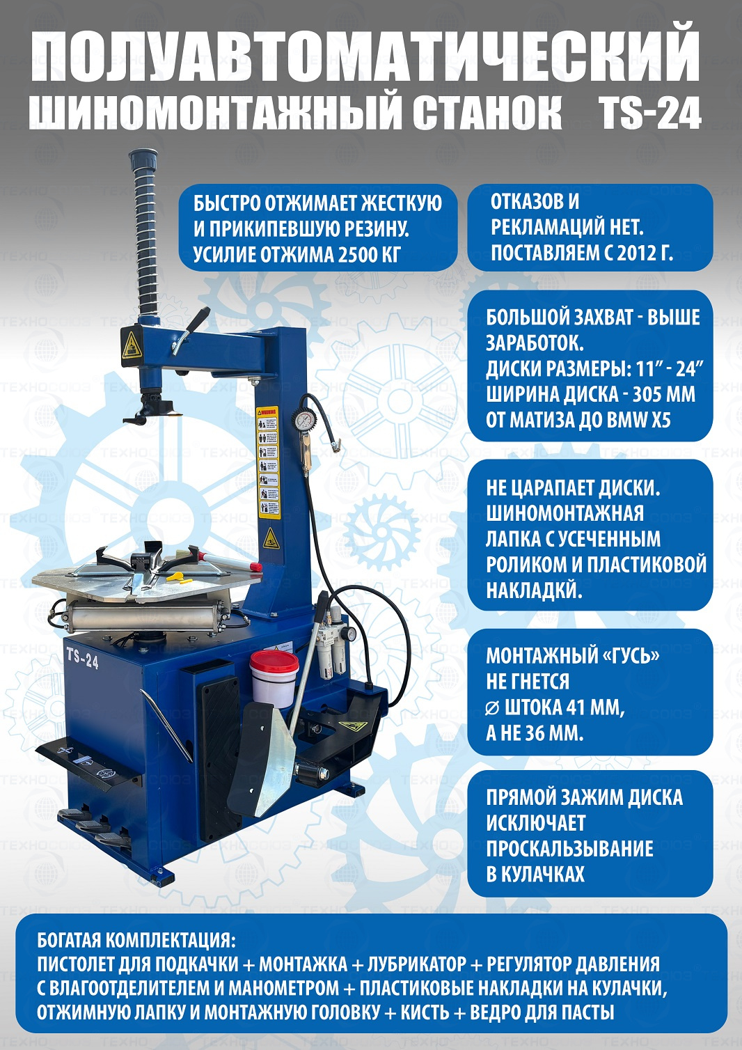 Шиномонтажного станка TS-24. Полуавтоматический. Квадратный стол. Для дисков:11÷24”. Усилие отрыва покрышки 2700 кг. В комплекте: пистолет для подкачки шин + монтажка + пластиковые накладки на зажимные кулачки + регулятор давления с влагоотделителем и манометром. Напряжение шиномонтажных станков 220В или 380В на выбор.