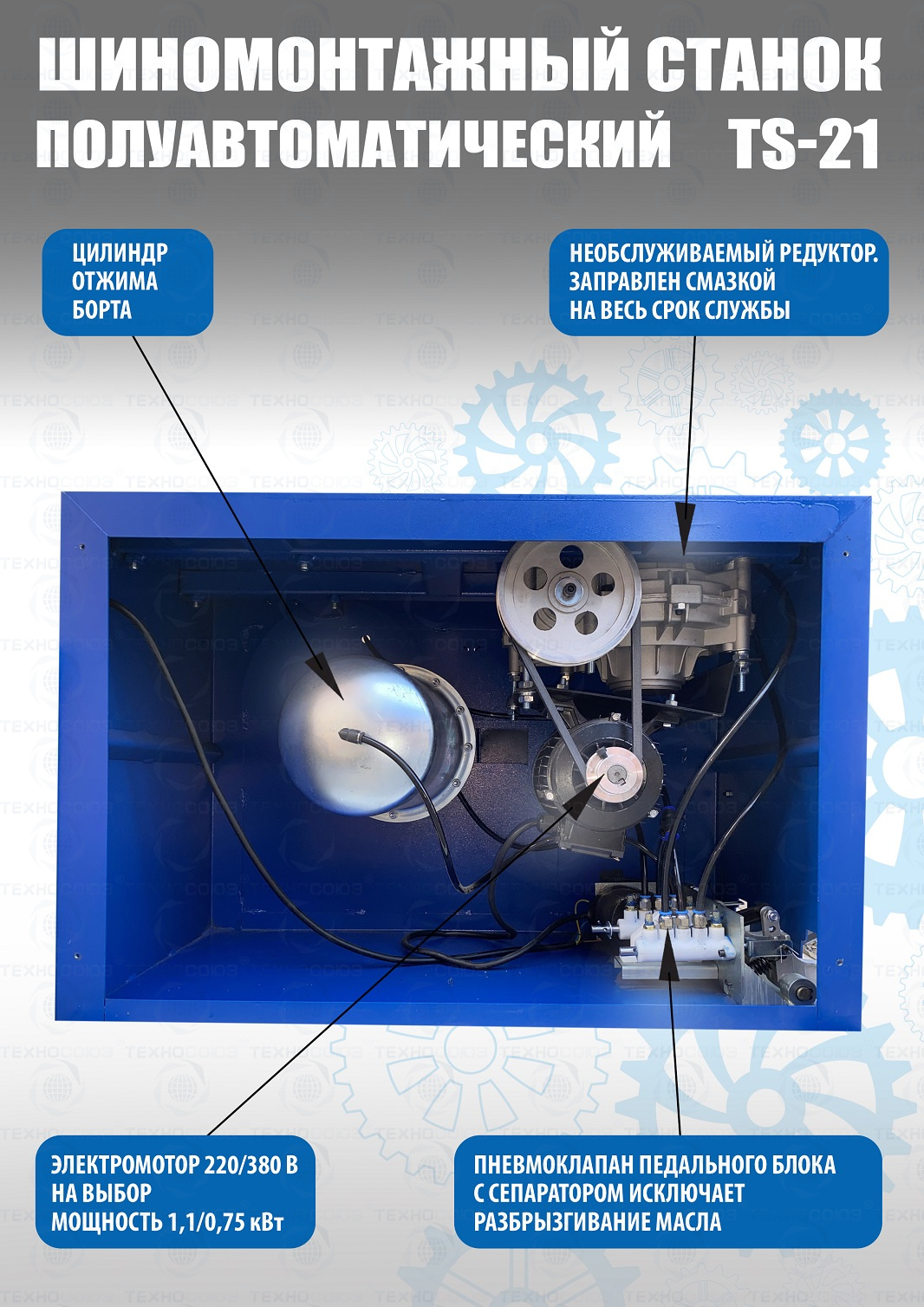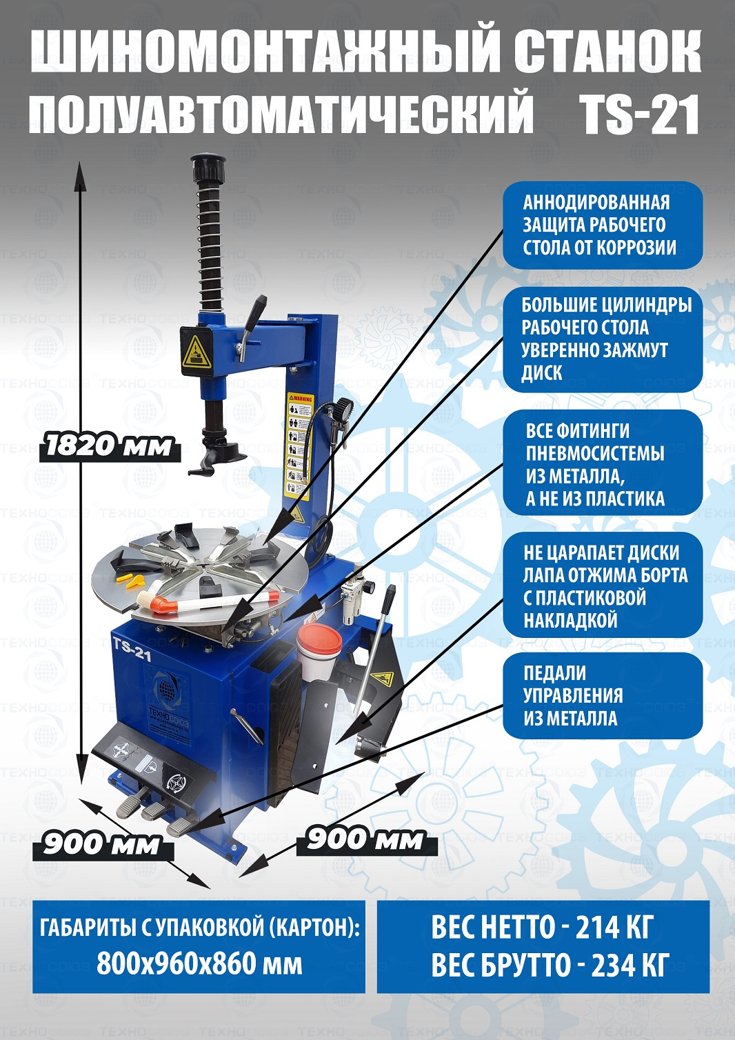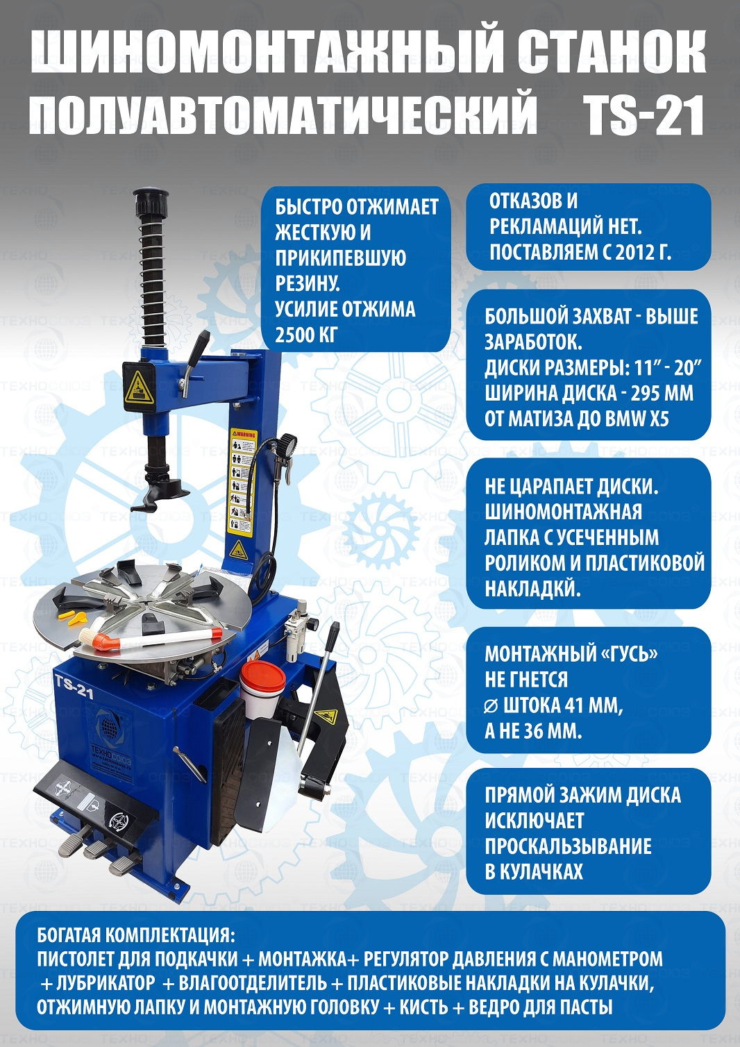 Полуавтоматического шиномонтажного станка TS-21 предназначен для монтажа и демонтажа колес легковых автомобилей, джипов и коммерческой техники. Для дисков: внешний 11÷18”, внутренний 12÷20”. В комплекте: пистолет для подкачки шин + монтажка + пластиковые накладки на зажимные кулачки + регулятор давления с влагоотделителем и манометром. Рекомендуется для постов со средней и высокой проходимостью.