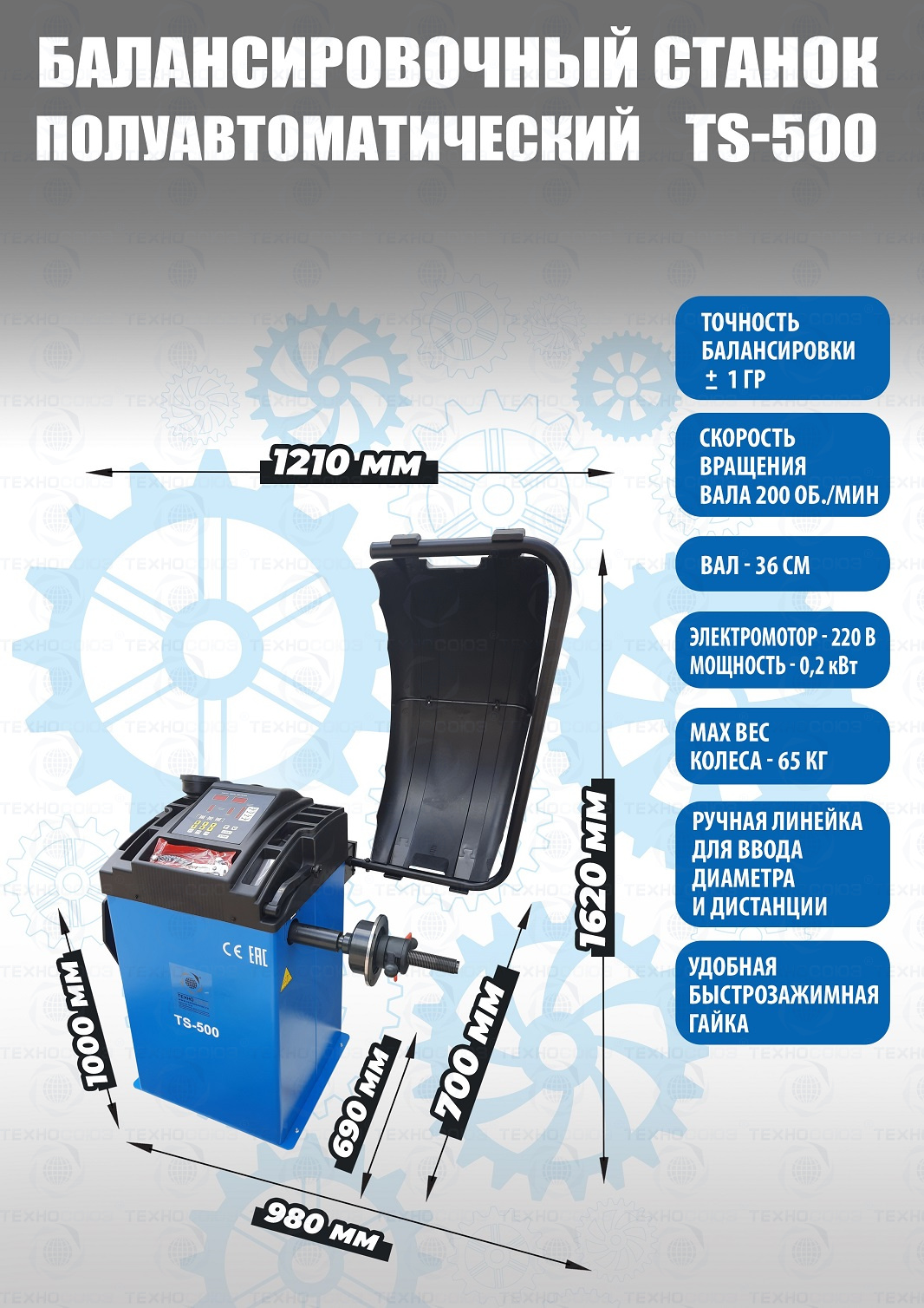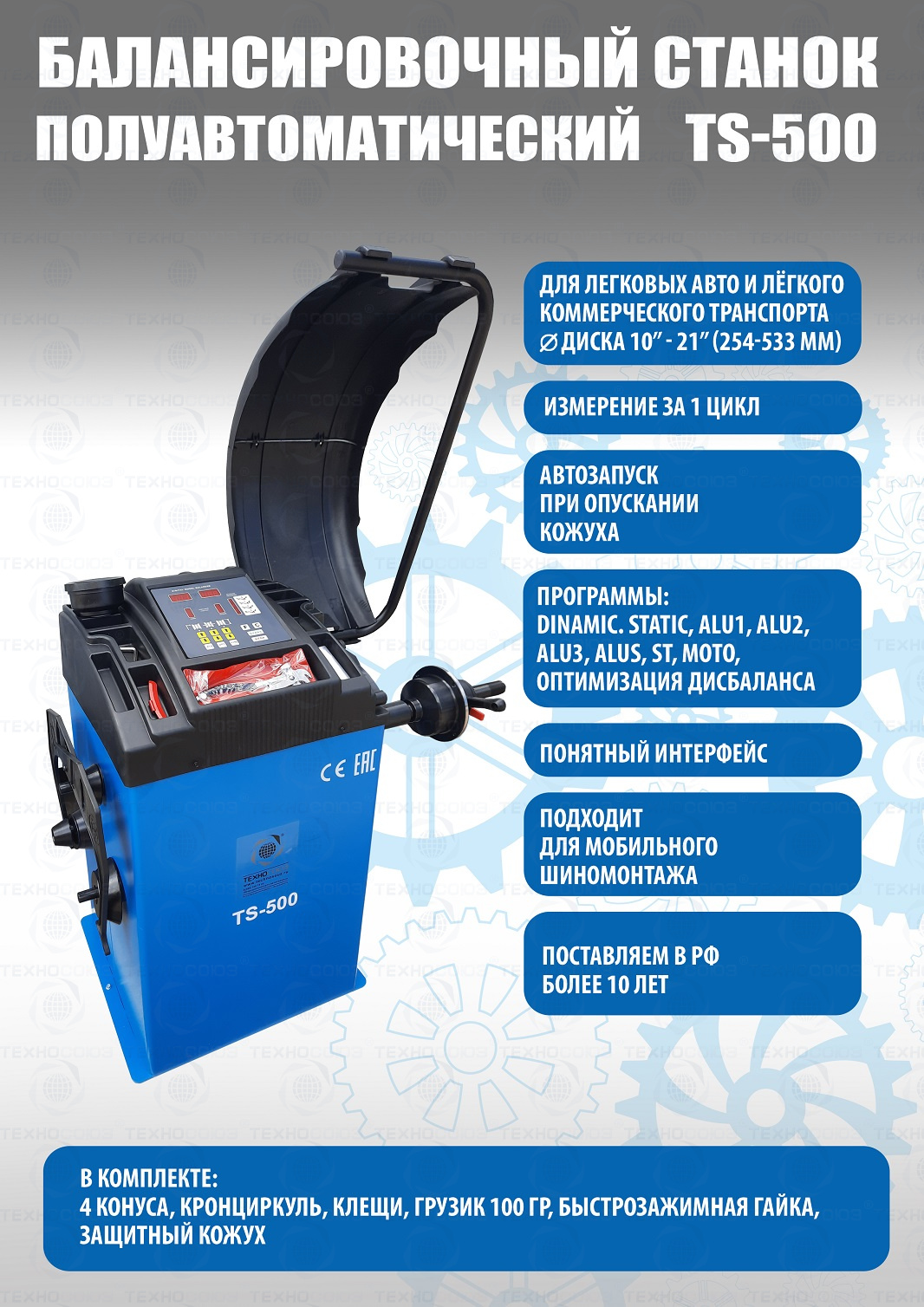 + TS-500 Балансировочный станок для колес легковых автомобилей, мотоциклов и легких грузовиков с диаметром диска с резиной до 760 мм. Размеры диска: ширина 3–9” (76-228 мм) , диаметр диска" - 10–21” (254-533 мм). Вал-36 мм. Максимальный вес колеса с диском – 65 кг. Точность ±1гр. Напряжение 220В. В комплекте: кожух с автозапуском + клещи + кронциркуль + быстрозажимная гайка + набор конусов. Данные станки возим более 10 лет. Надежные - не подведут в сезон!!!